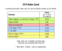 ITV archive rate card ITV Rate Card Commercial transfer rates only, for use fee please contact us for details. Price Format per ½ hour of material Tape (Digibeta, SP, DVCAM) to Tape / FTP £115 …
