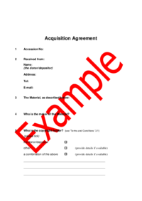 Acquisition Agreement Acquisition Agreement 1 Accession No: 2 Received from: Name: (the donor/depositor) Address: Tel: E-mail: 3 The Material, as described below: 4 Who is the maker of the…